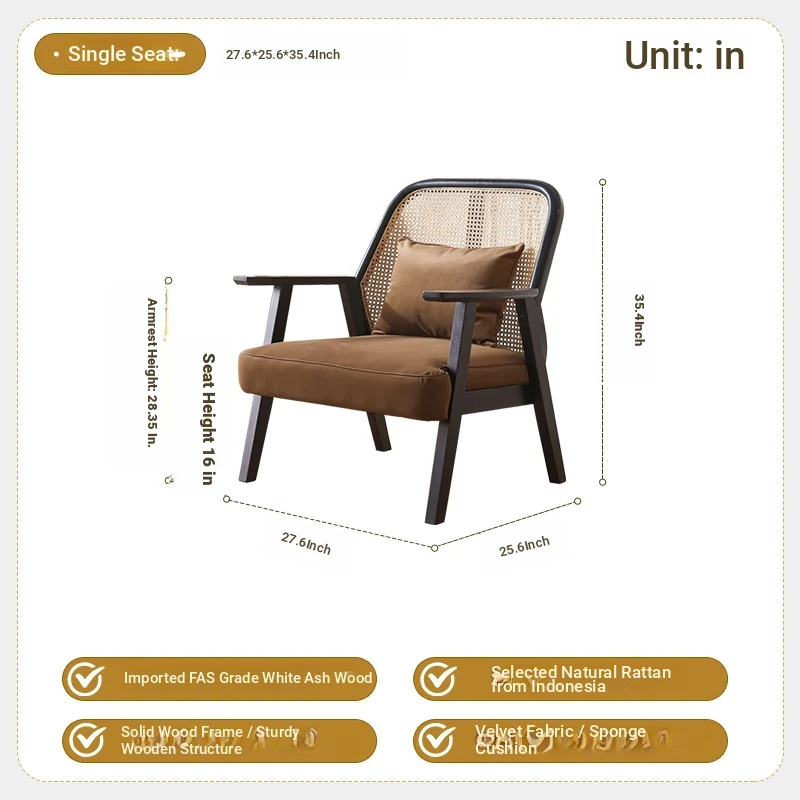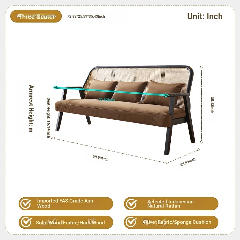 Nordic Solid Wood Sofa Set for Small Living Rooms - Modern Minimalist Rattan Sofa for Home, Perfect for Airbnb and Trendy Spaces, 3-Seater Design