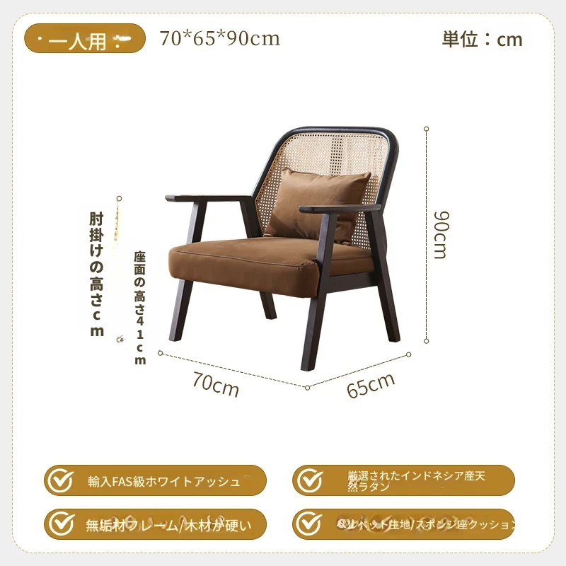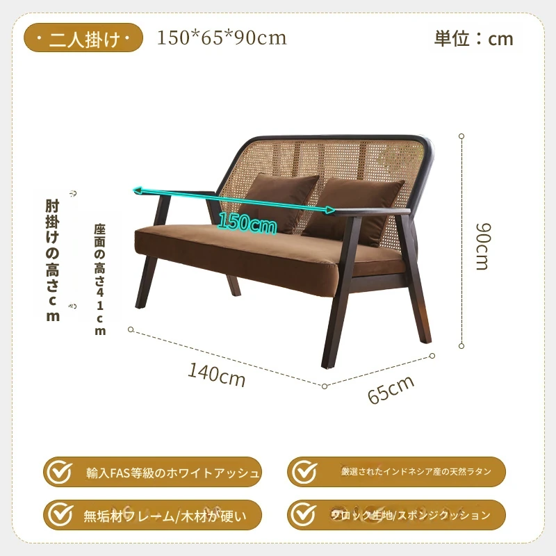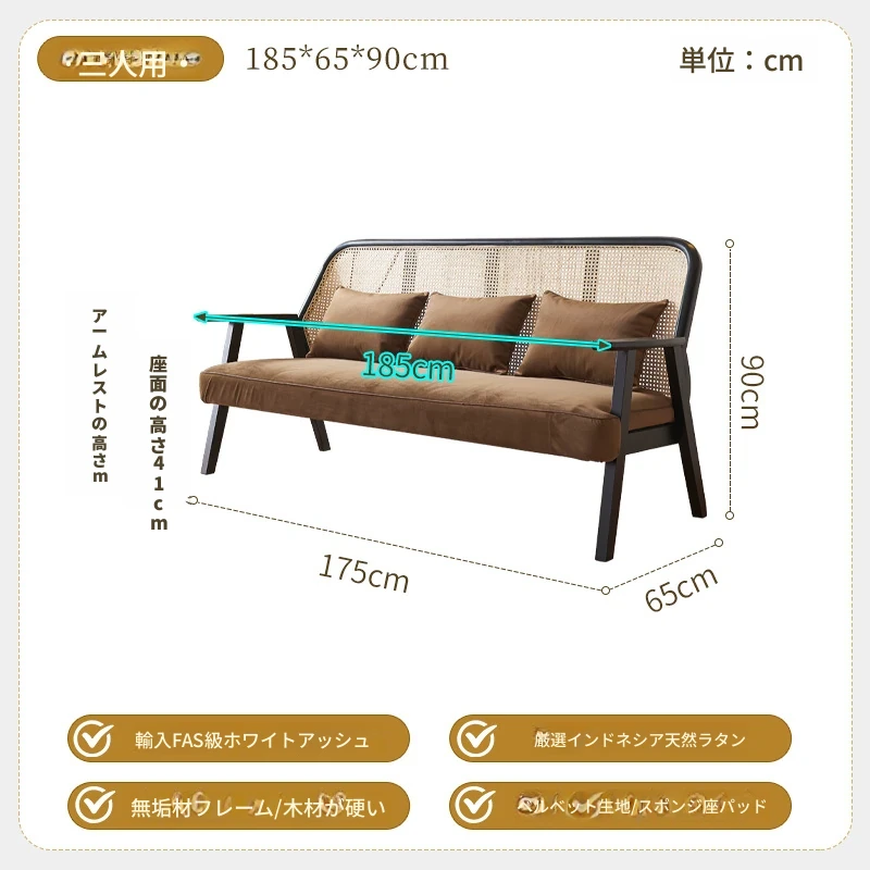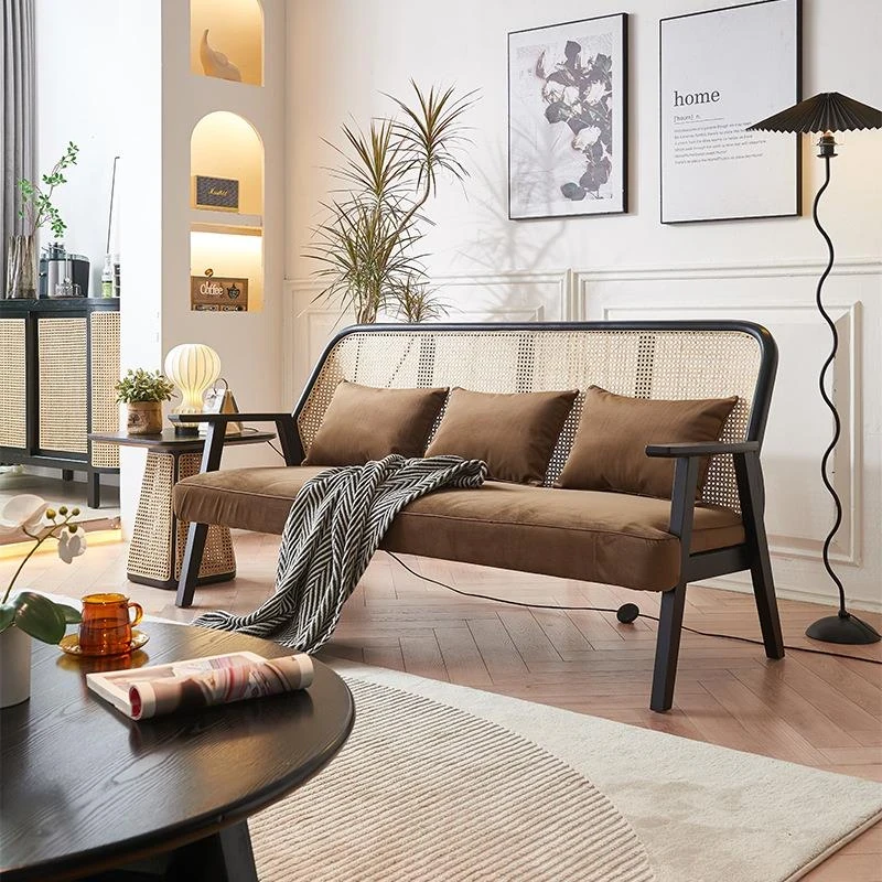 北欧スタイルの無垢材ソファセット|小型リビングに最適なモダンでシンプルなデザイン|人気の民宿風3人掛けラタンソファで心地よい空間を演出!