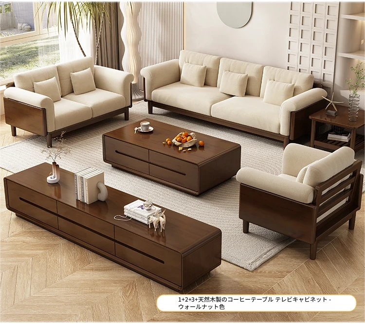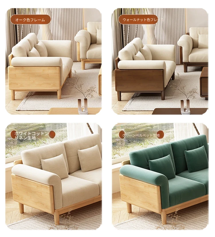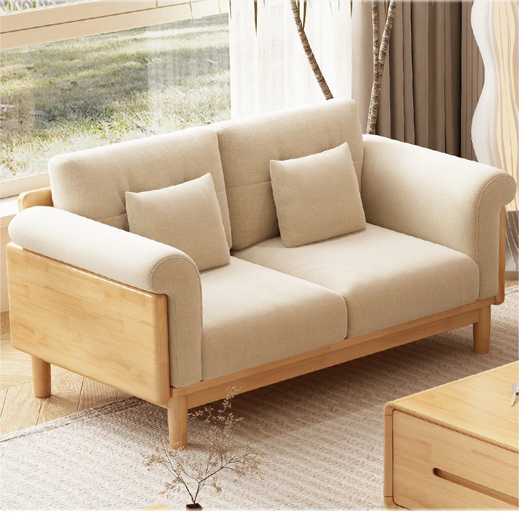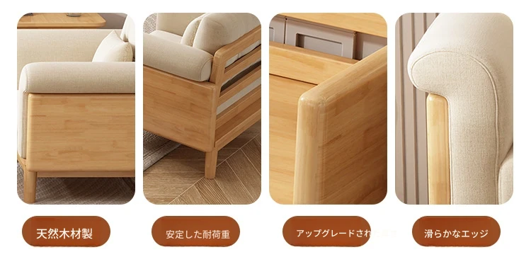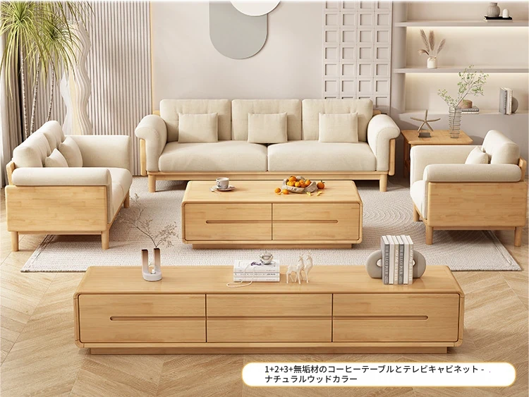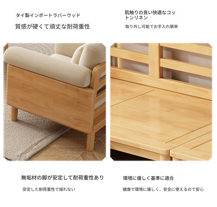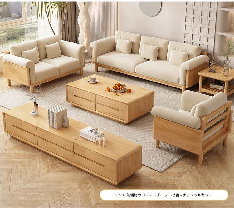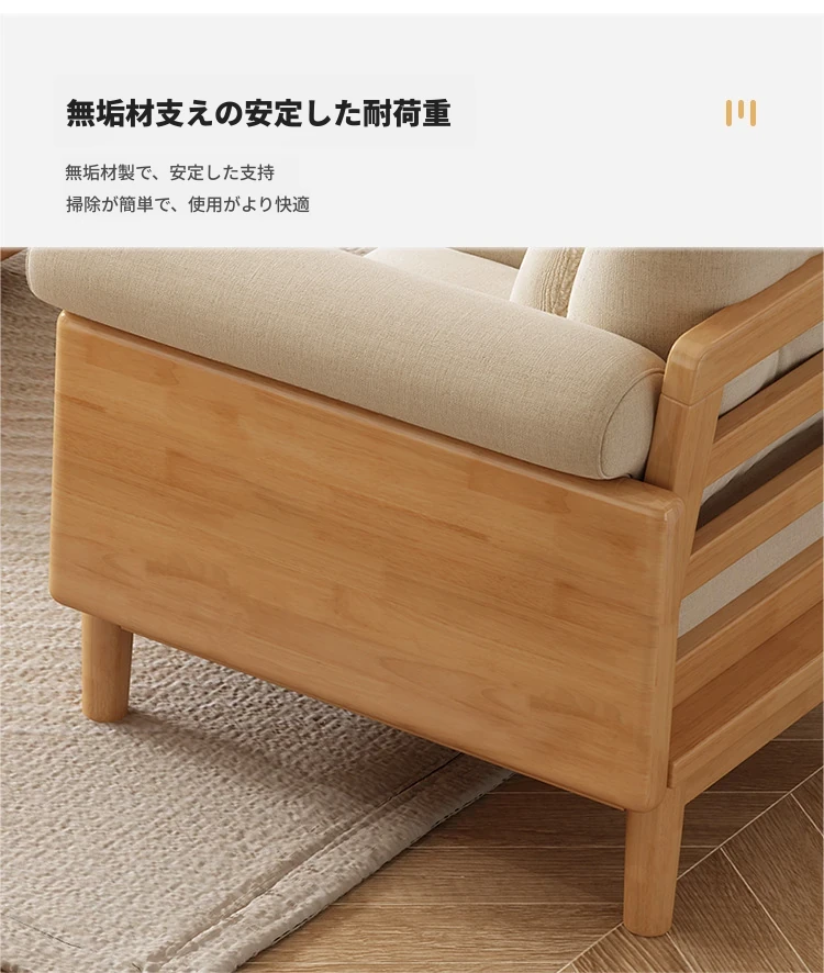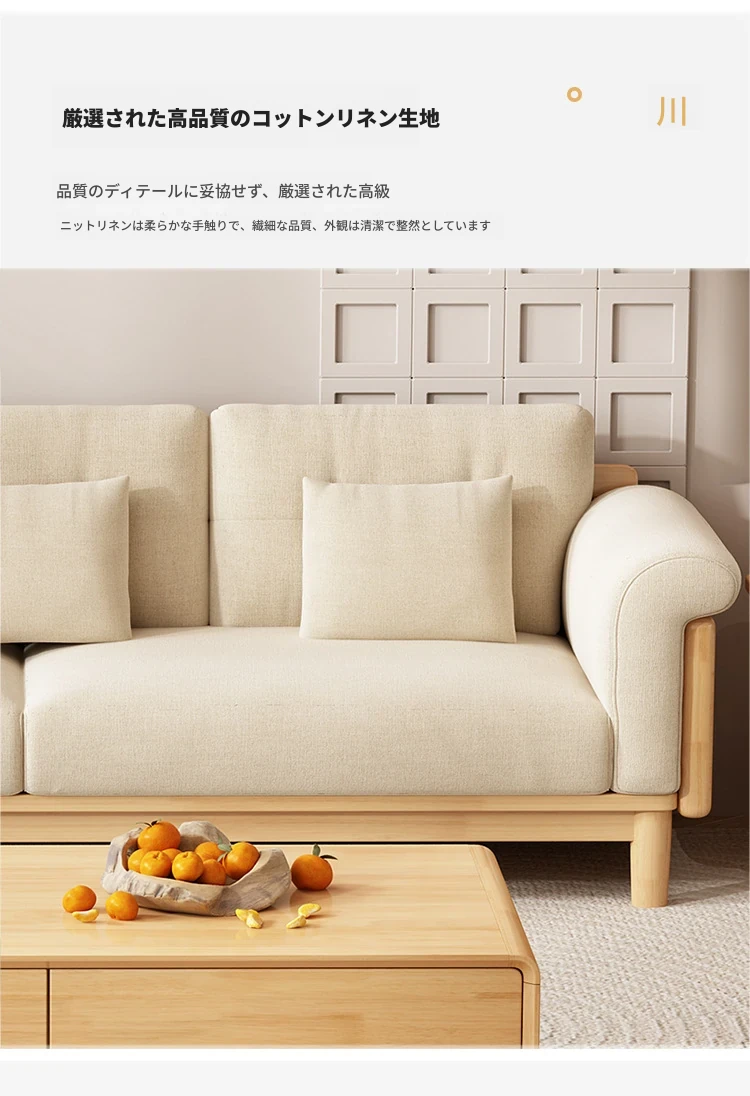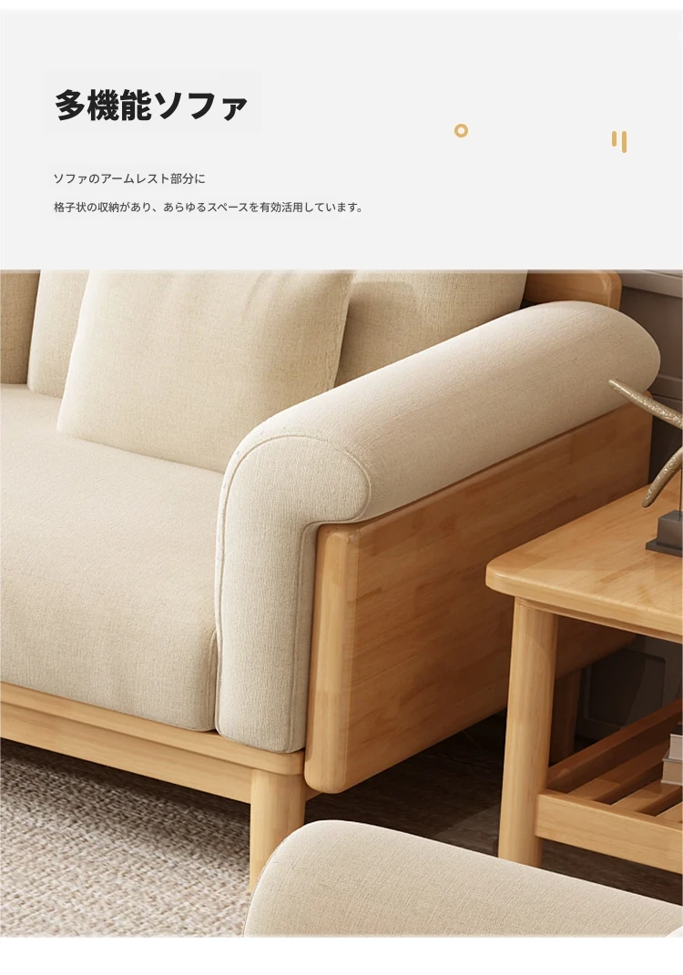 北欧スタイルの無垢材ソファ|モダンでシンプルなデザイン|小型リビングに最適|クリームカラーの和風ファブリックソファ|おしゃれで快適な居住空間を演出します!