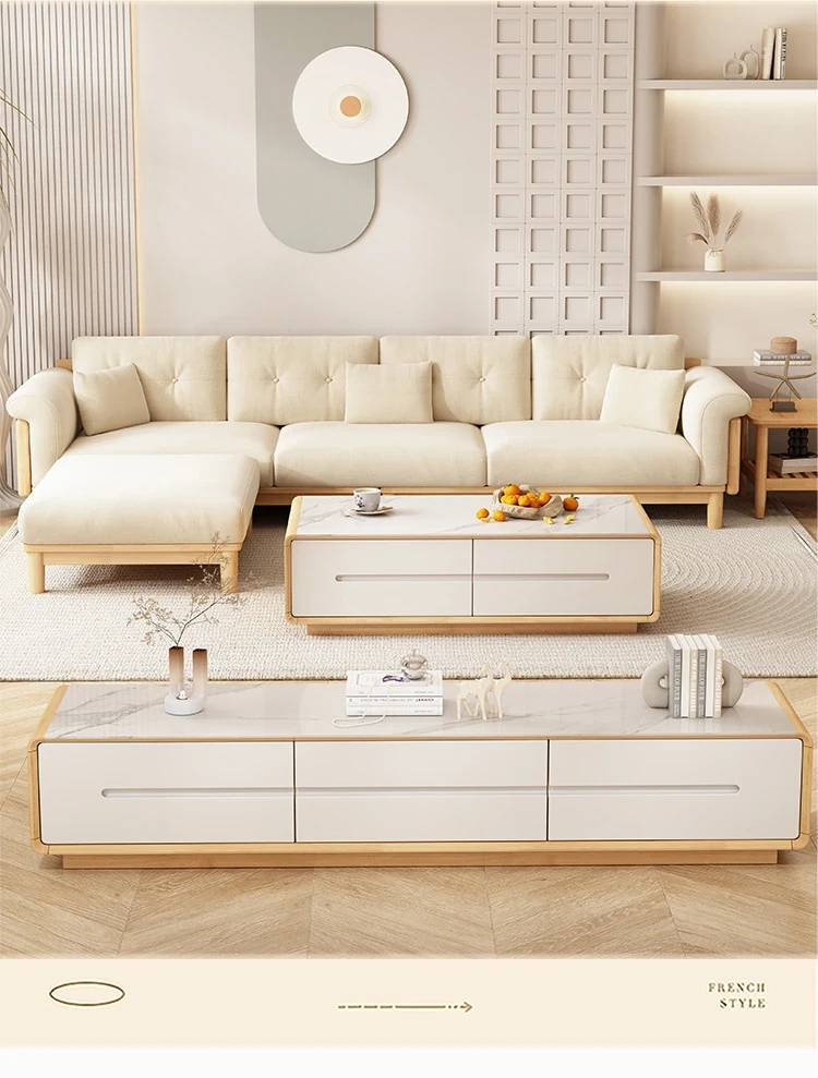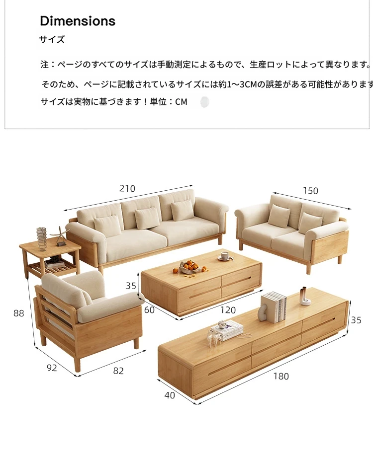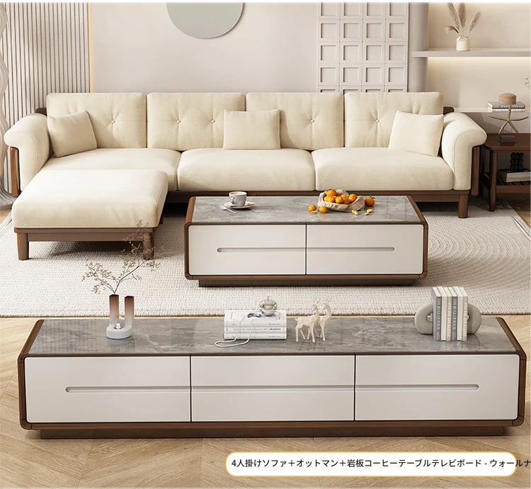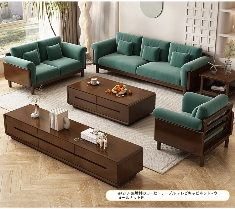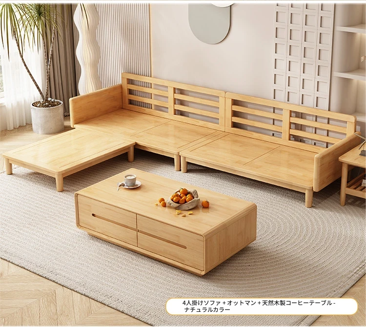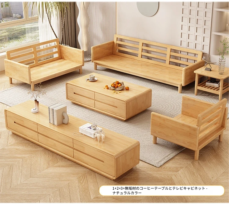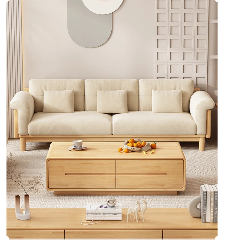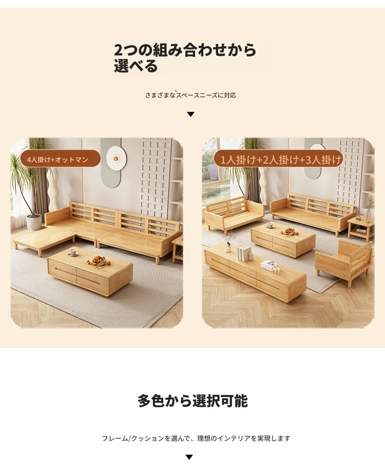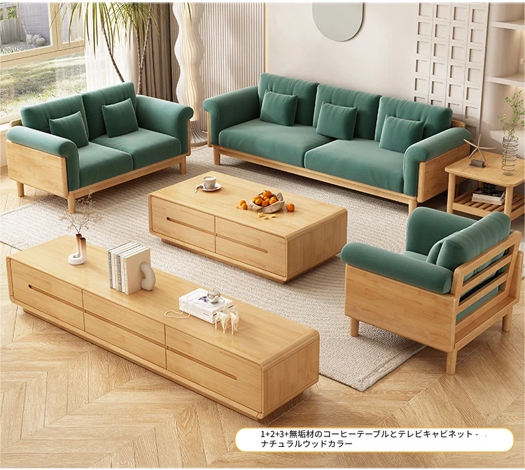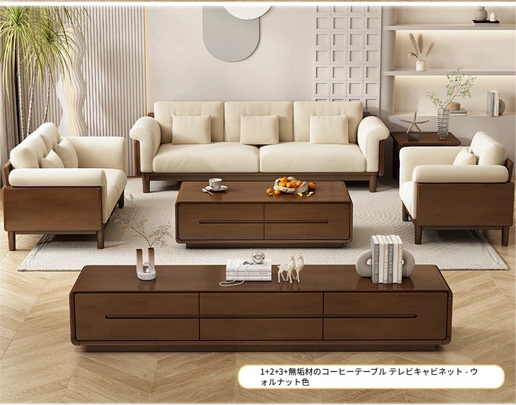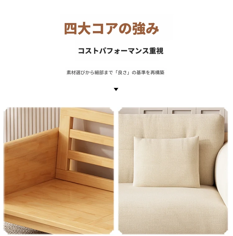 北欧スタイルの無垢材ソファ|モダンでシンプルなデザイン|小型リビングに最適|クリームカラーの和風ファブリックソファ|おしゃれで快適な居住空間を演出します!
