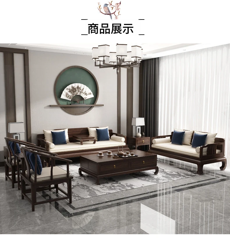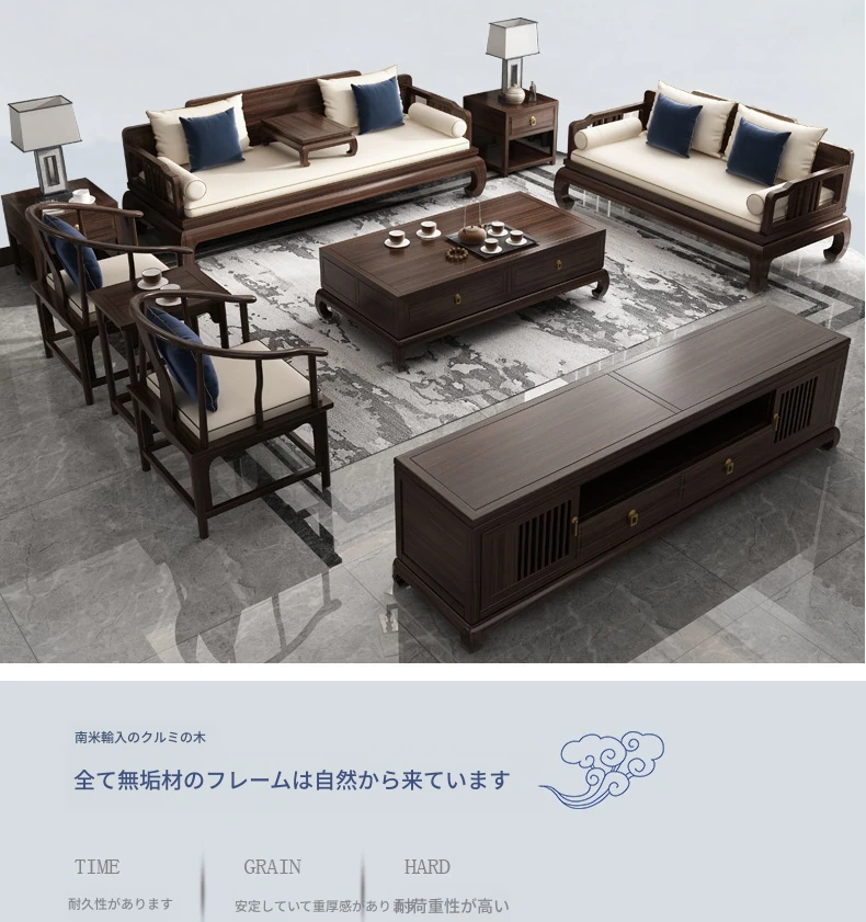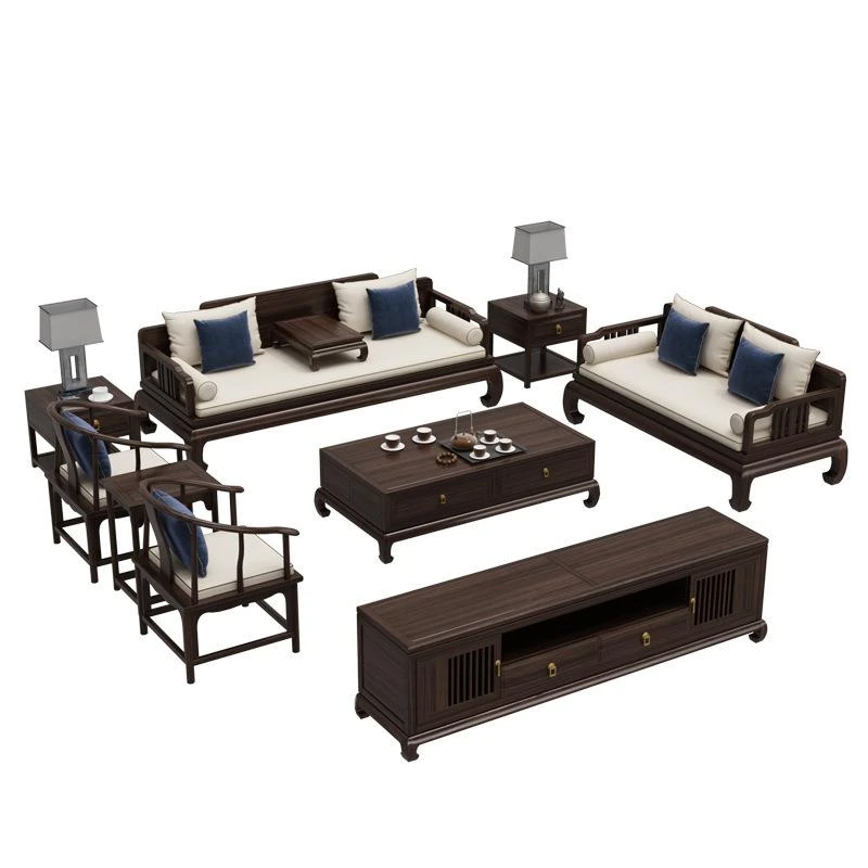 ウォールナット新中式無垢材ローハンソファセット - 現代古典の高級別荘リビングに最適なエボニーファニチャー。優雅で洗練されたデザインが、あなたの空間を格上げします。