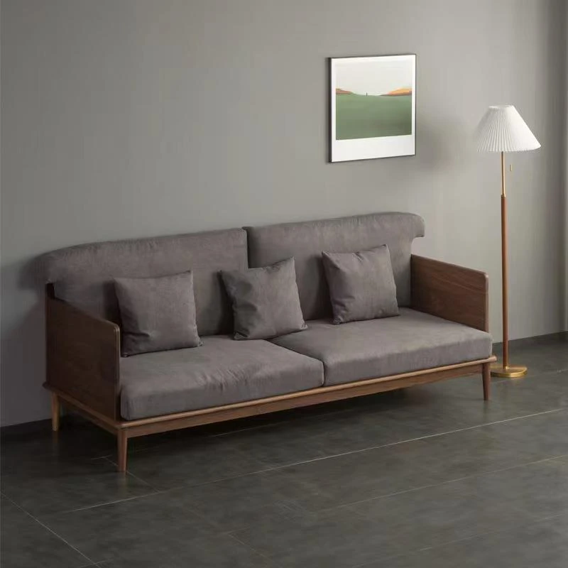北欧スタイルの全木製ソファ - クルミ材使用、シンプルでモダンなデザイン、テクノロジー布と本革のコンビネーション。リビングルームにぴったりな高級家具で、快適さとスタイルを両立!