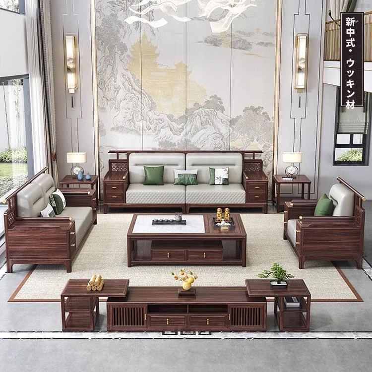 ウォールナット無垢材ソファーセット|中華スタイルのリビングに最適|冬夏使える収納付きコーヒーテーブル|小型から大型の部屋まで対応|家族と友人とのくつろぎのひとときを提供!