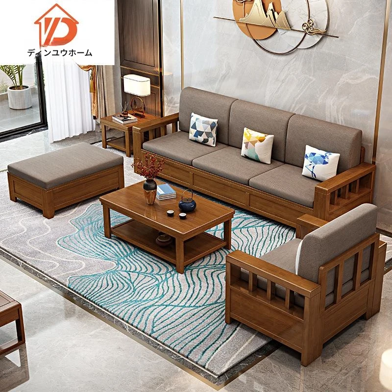 リビングに最適!新中式デザインのシンプルな天然木製ソファセット。貴妃木と布を使った収納付きハイバックソファ、狭いスペースでもおしゃれに収納力アップ!