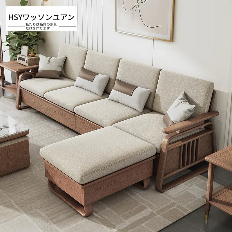 新中式スタイルの無垢材ソファセット - モダンでシンプル、小型住宅に最適!ウッドウィスカー仕上げで、洗濯可能なカバー付き。全て無垢材使用で、心地よいくつろぎの空間を実現します。