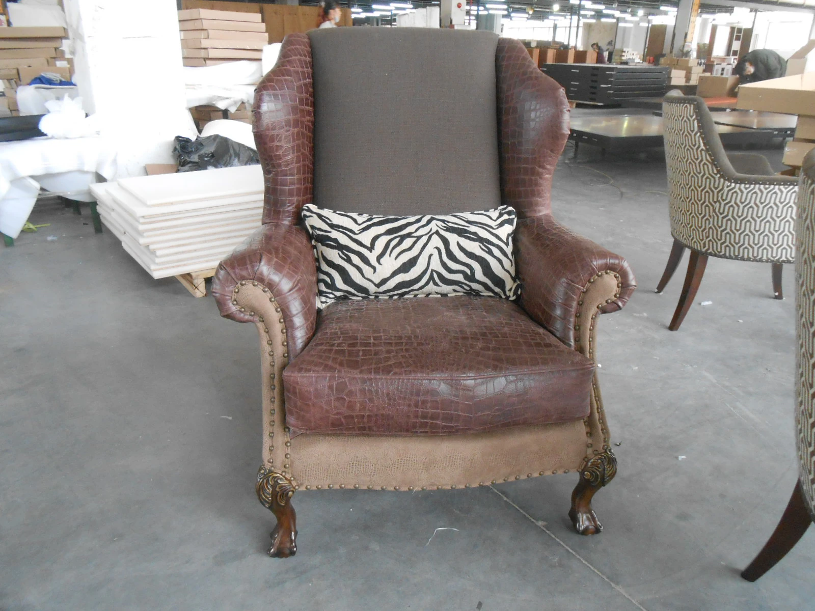 輸出用アメリカンスタイルのリビング家具、タスカニーシリーズの虎脚アームチェア。高品質な合皮使用で、在庫あり!おしゃれで快適な空間を演出する一品。
