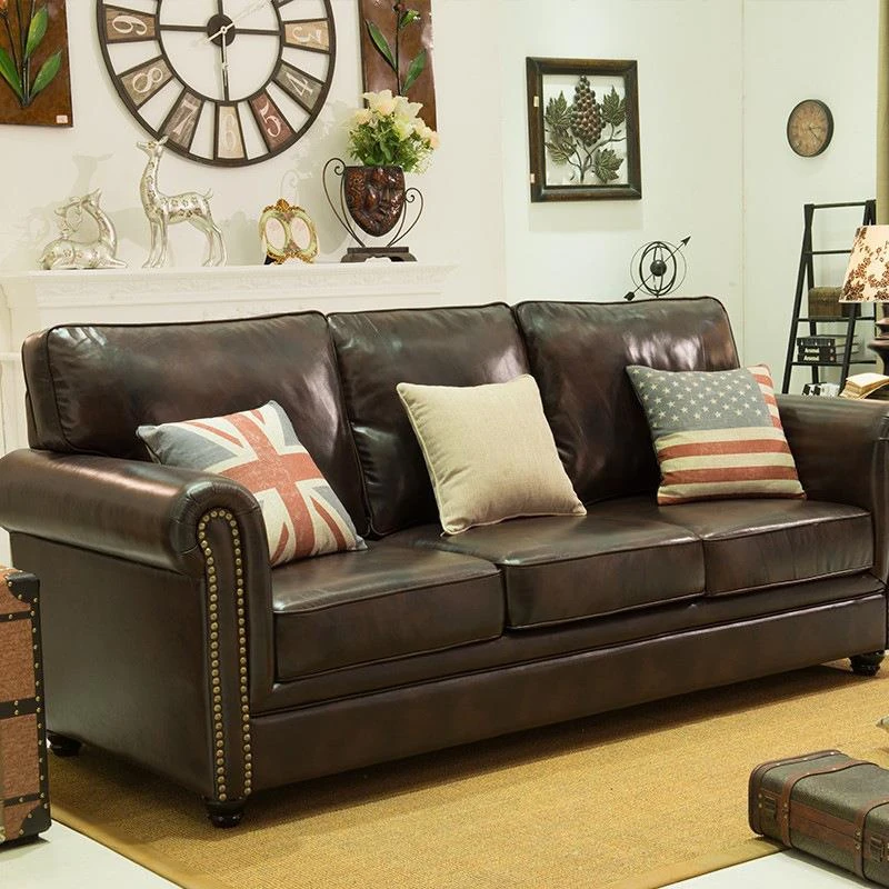 シンプルでモダンなレトロアメリカンスタイルの本革ソファ3人掛けセット - 小型リビングにぴったりな高級牛革使用のスタイリッシュなデザイン!快適さと美しさを兼ね備えたおしゃれ空間を演出します。