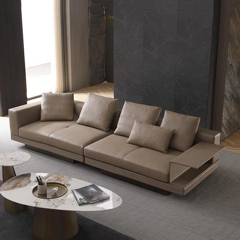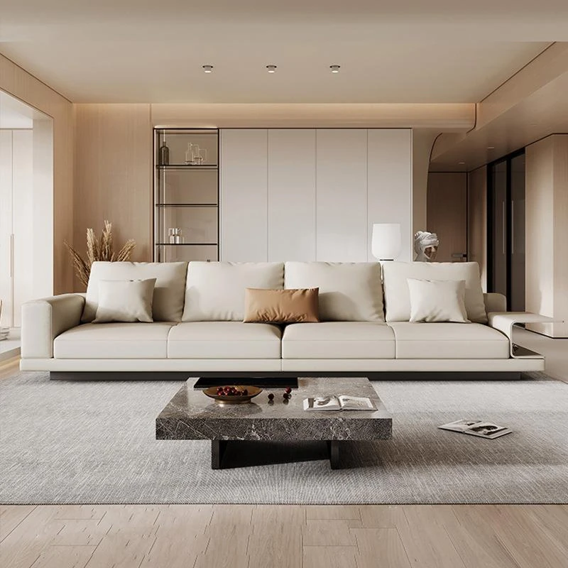 コンナリークリーム風本革ソファ|現代的でシンプルな高級別荘デザイン|広々としたリビングルームに最適なソファ