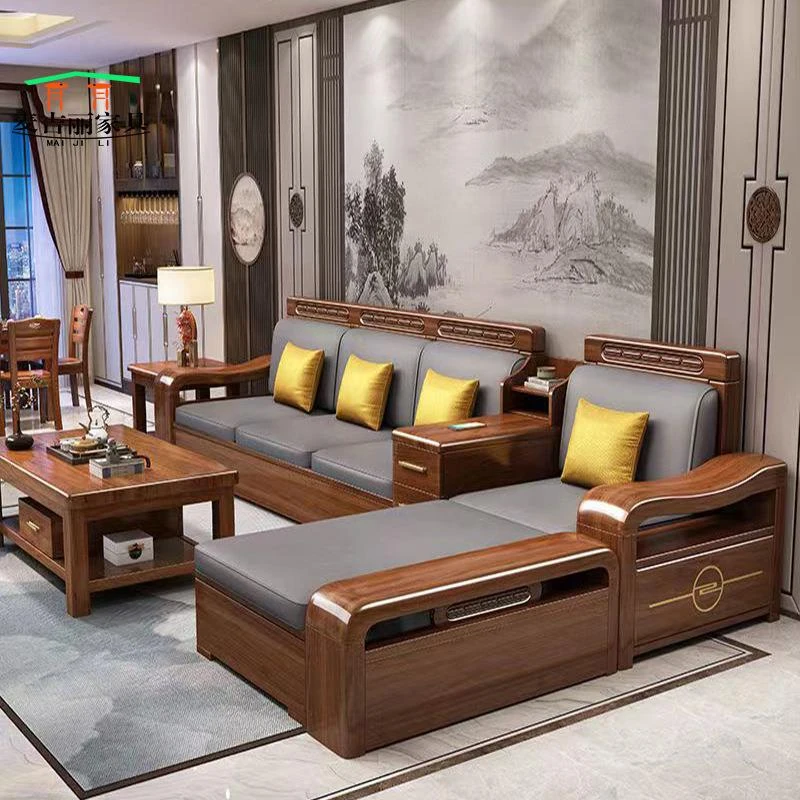 Modern Chinese-Style Solid Wood Black Gold Sofa Set for Living Room – Versatile Furniture for Villas and Apartments, Suitable for All Seasons