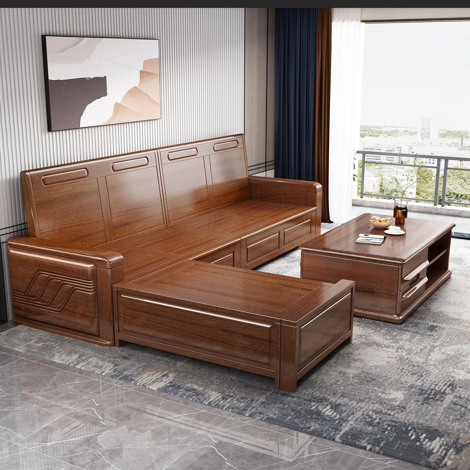 Modern Minimalist Solid Wood Sofa in Red Sandalwood - Versatile Day and Night Use, Stylish Chaise Lounge Corner Sofa with Storage for Your Living Room
