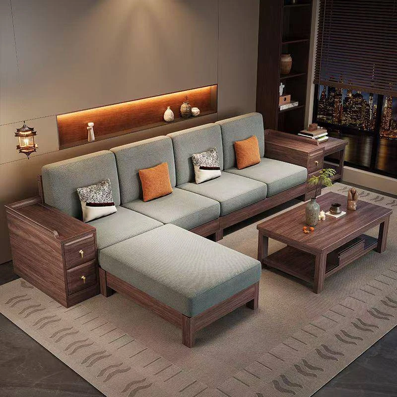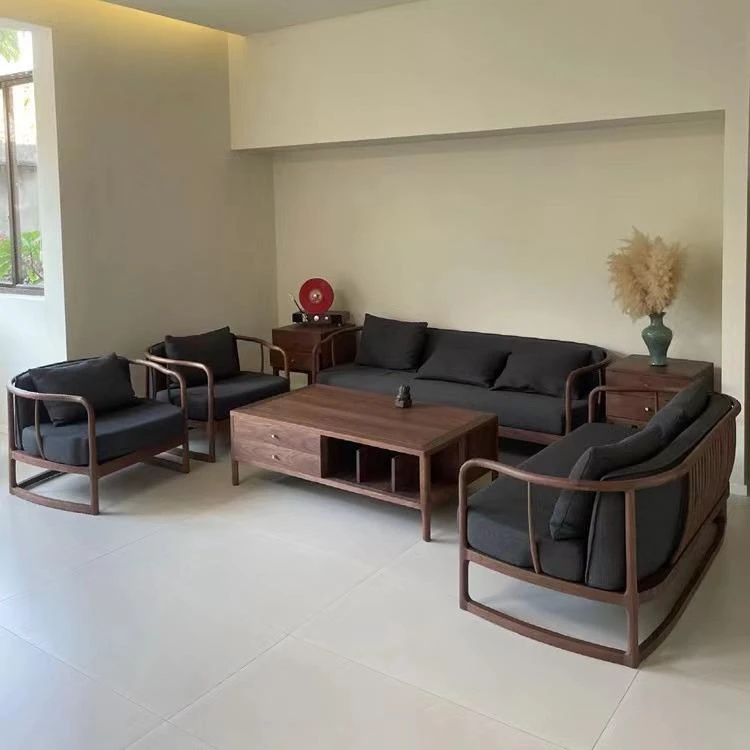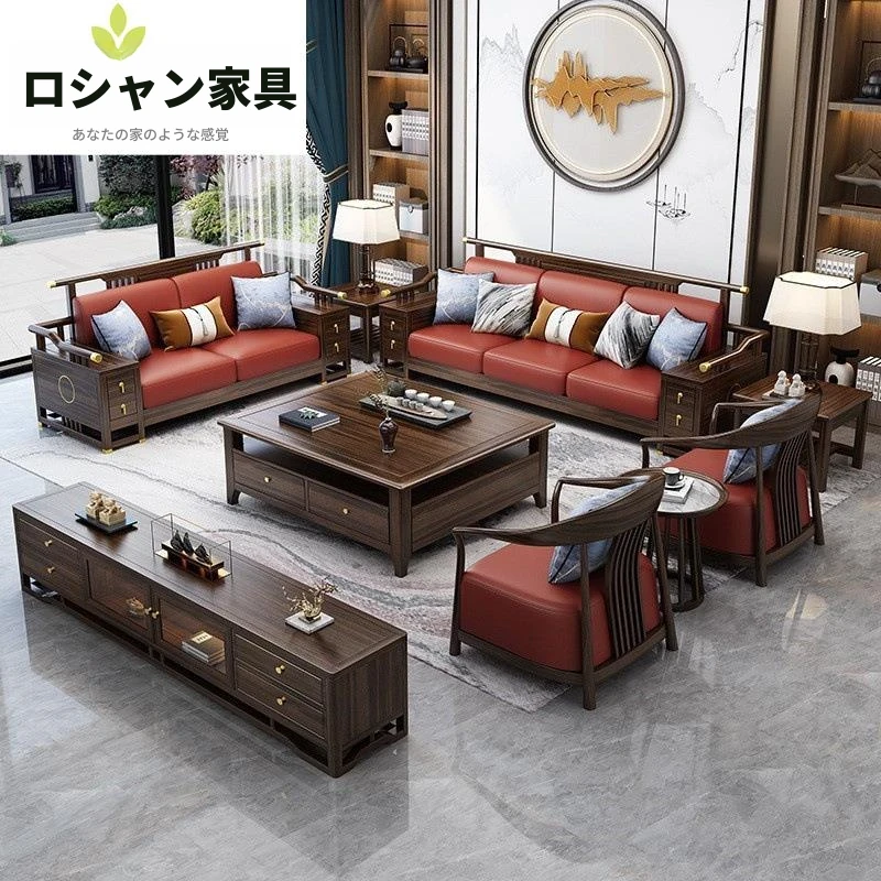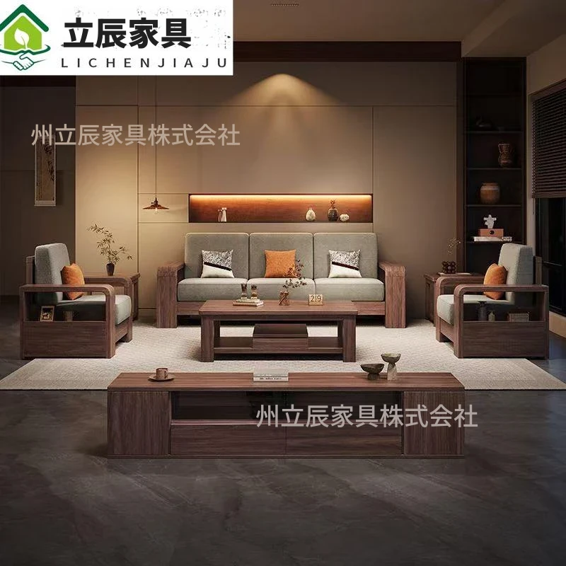 新中式ブラックウォルナット無垢材ソファセット|モダンでシンプルなデザイン|ファブリック収納付き|大小さまざまなお部屋に最適なリビング家具