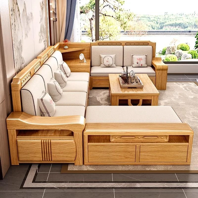 全実木製ソファー|モダン中式デザイン|リビングに最適!冬夏両用&小型スペースにピッタリなコーナーストレージ付き無垢材ソファーで、快適な居心地を実現!