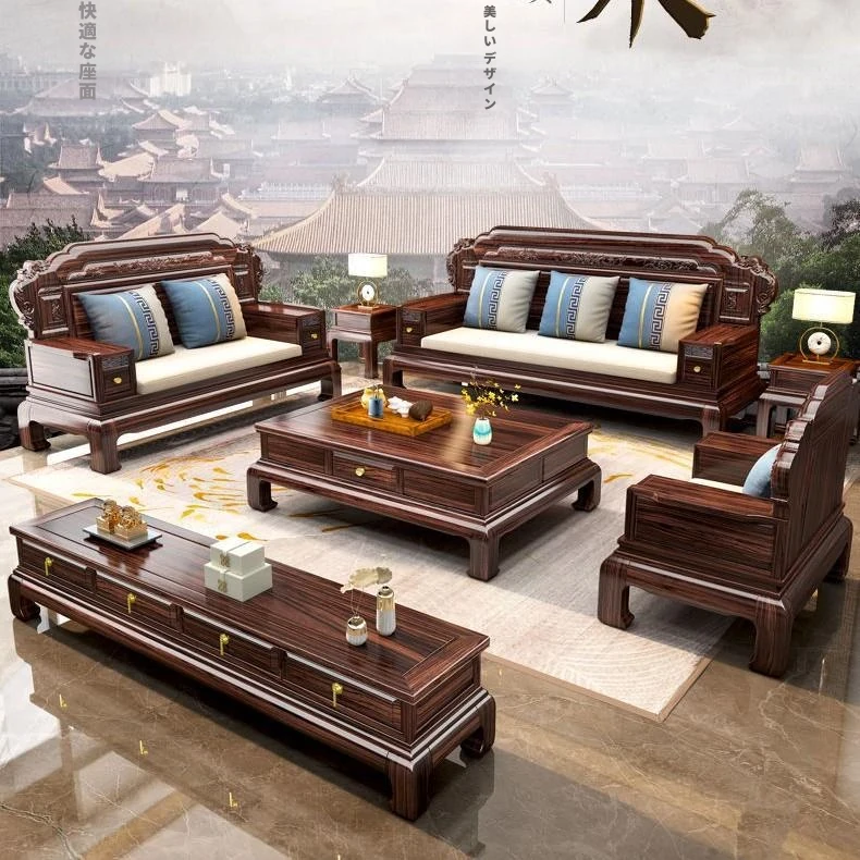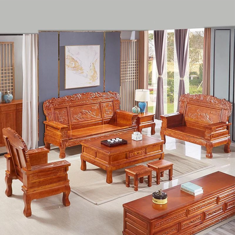 冬夏兼用のウコン木製フルソリッドソファセット - モダンと古典が融合したリビングルーム用、大小様々な住宅に最適な中華風家具。快適さとスタイルを両立した贅沢な空間を演出します!