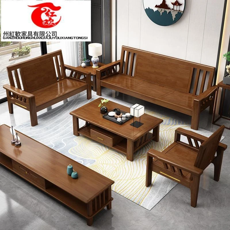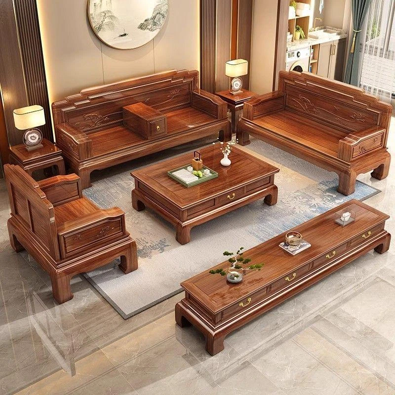 新中式ウッドソファセット|スタイリッシュなウッディデザインで、大小さまざまな住宅にぴったり!中国風の禅の雰囲気が漂う、心安らぐリビング空間を演出します。高品質なウコン材を使用した贅沢な木製家具です。