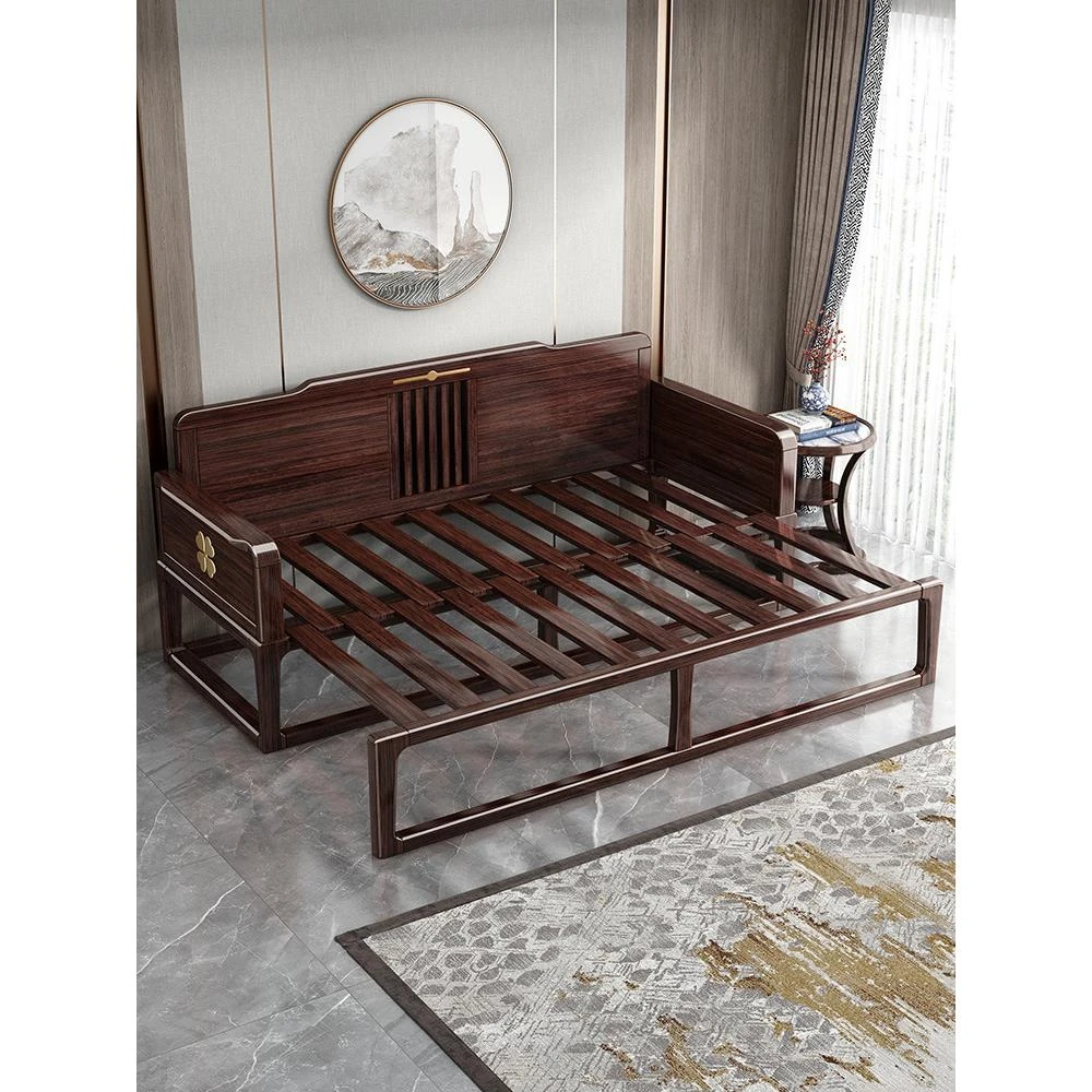 新中式高級実木ロハンベッド - 紫金檀材使用、コンパクトな小型住宅向け、禅の雰囲気を醸し出す、スライド式で伸縮可能なソファベッド!快適な眠りとスタイリッシュな空間を実現!
