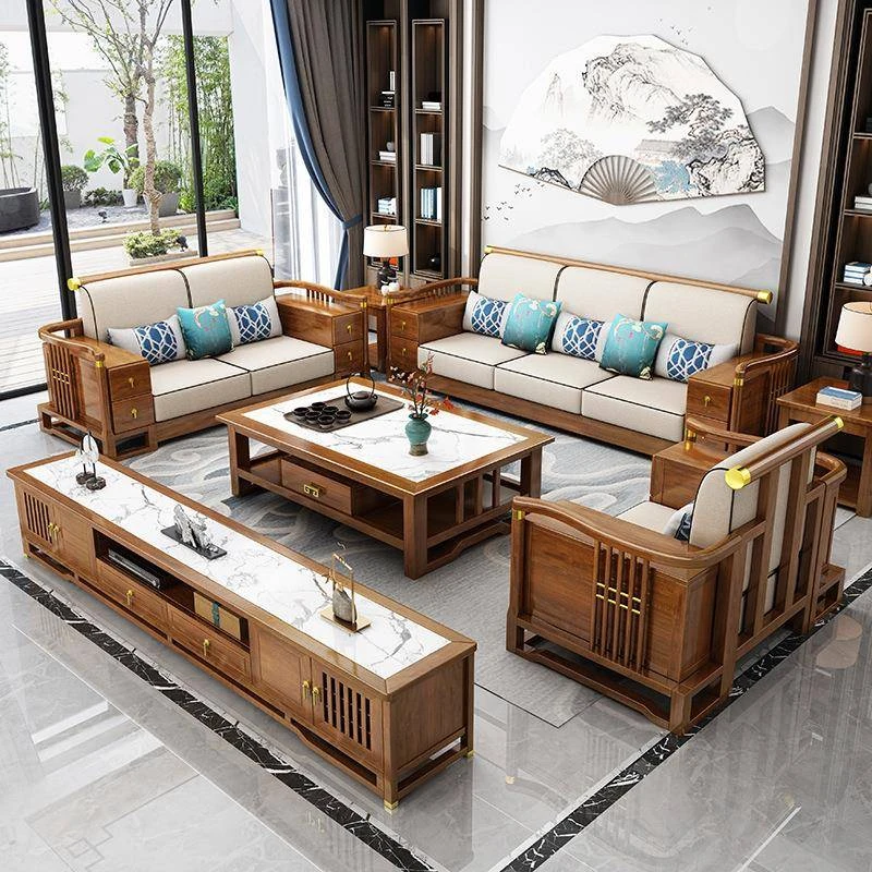 ウーキンウッドの新中式スタイルの無垢材ソファとテーブルセット - 冬夏両用、エレガントなデザインで別荘や家庭のリビングにぴったりの家具!