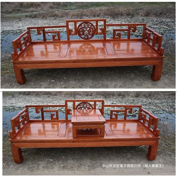 新中式スタイルの無垢材三人掛けソファ、リビングルームに最適なローハンベッド、楡の木製ダブルシート、シンプルでコンパクトなデザインの貴妃椅子、居心地の良いひとときを提供します。